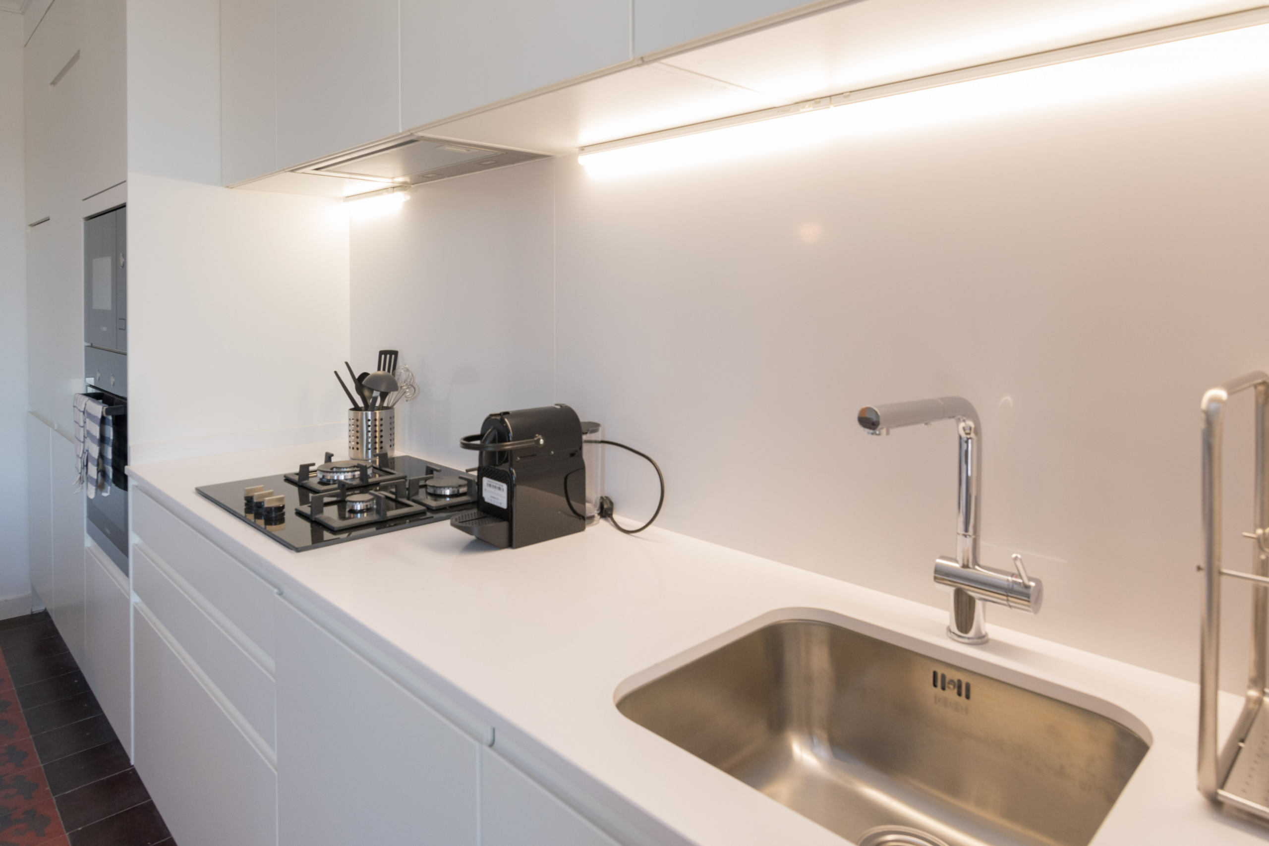 El salón posee un par de enormes ventanales que dan a la calle y un balcón privado. La cocina completamente blanca es un retrato de la modernidad. Está equipado con un conjunto de electrodomésticos de alta gama y gabinetes de laca mate.