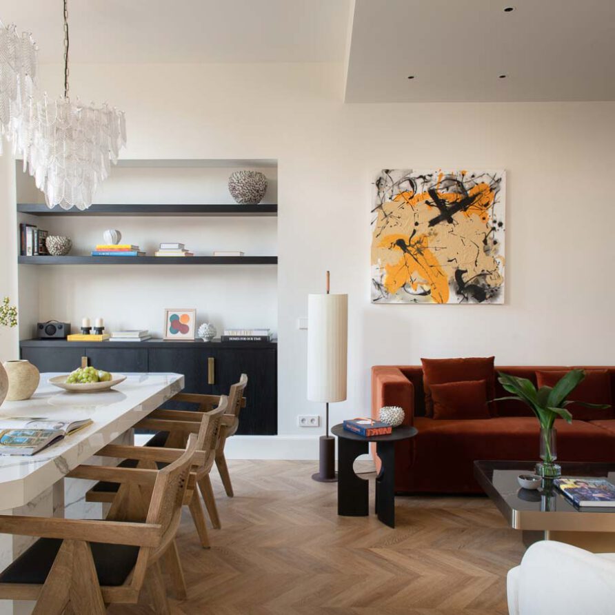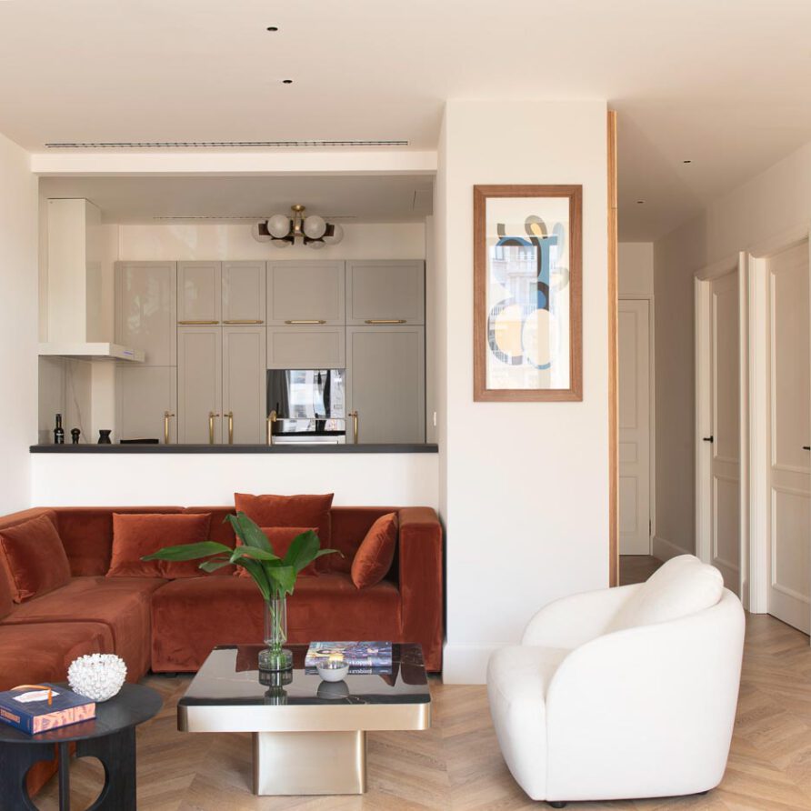 La acogedora sala de estar-comedor se integra armoniosamente con la cocina, creando un espacio fluido y sofisticado. Con un balcón que ofrece vistas a la avenida, estos apartamentos destacan por ser extraordinariamente silenciosos y luminosos, gracias a sus amplios ventanales.